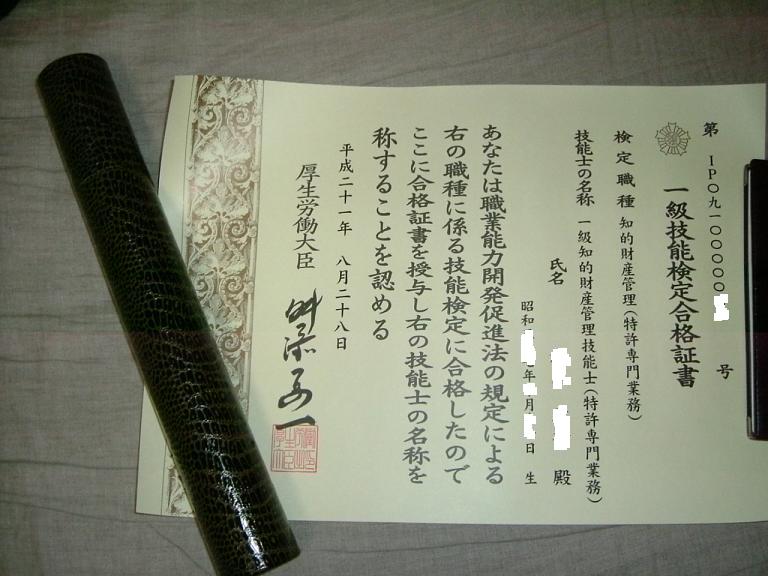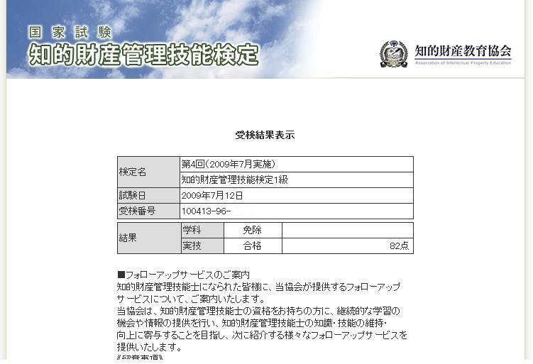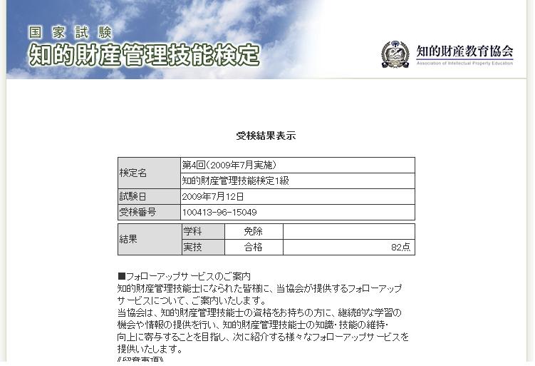 先月受験した、知的財産管理技能検定の1級実技試験の結果発表です。